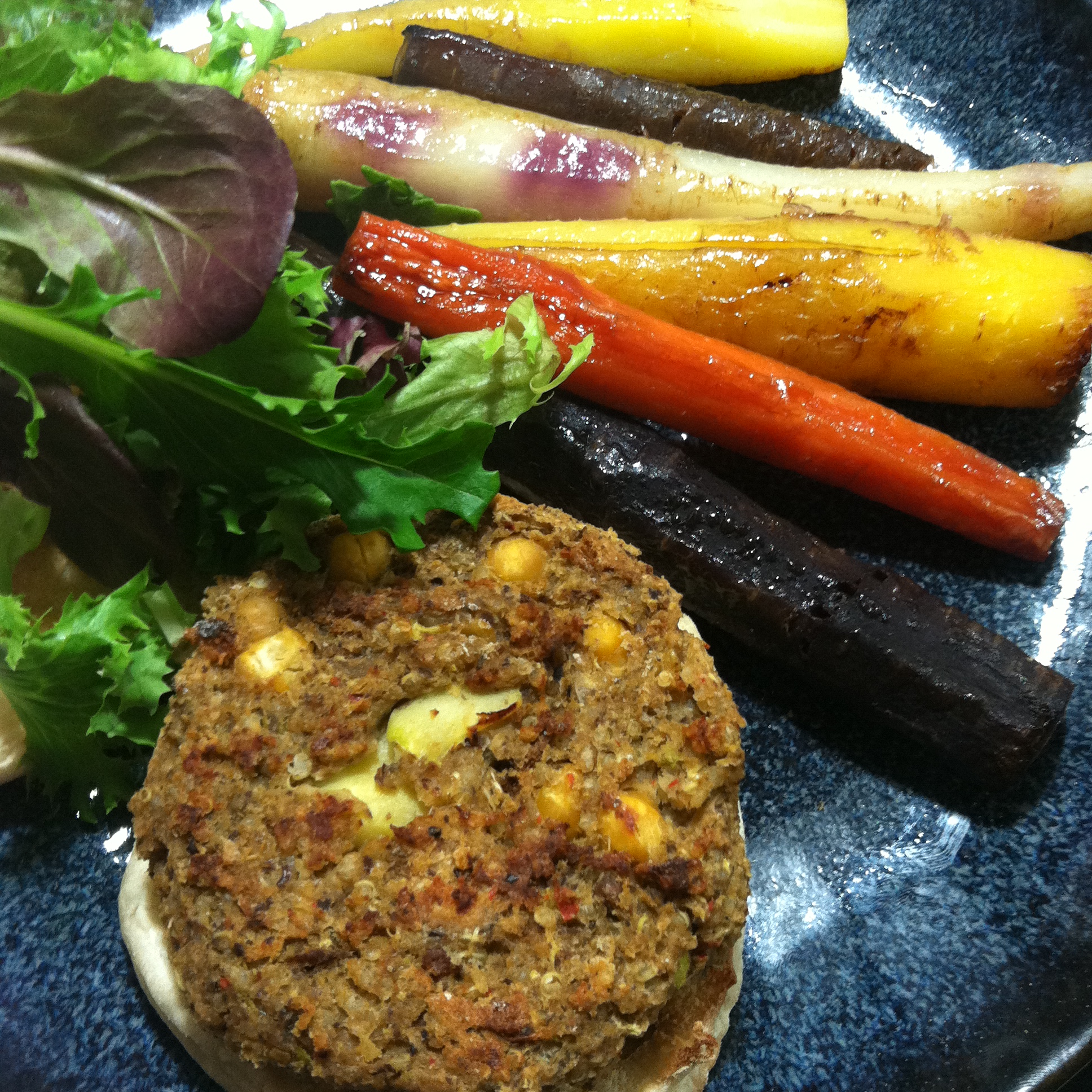 My longtime desire to create a veggie burger recipe that actually works on the grill without falling horribly apart has finally been realized, along with my longtime desire to cook tri-color carrots.