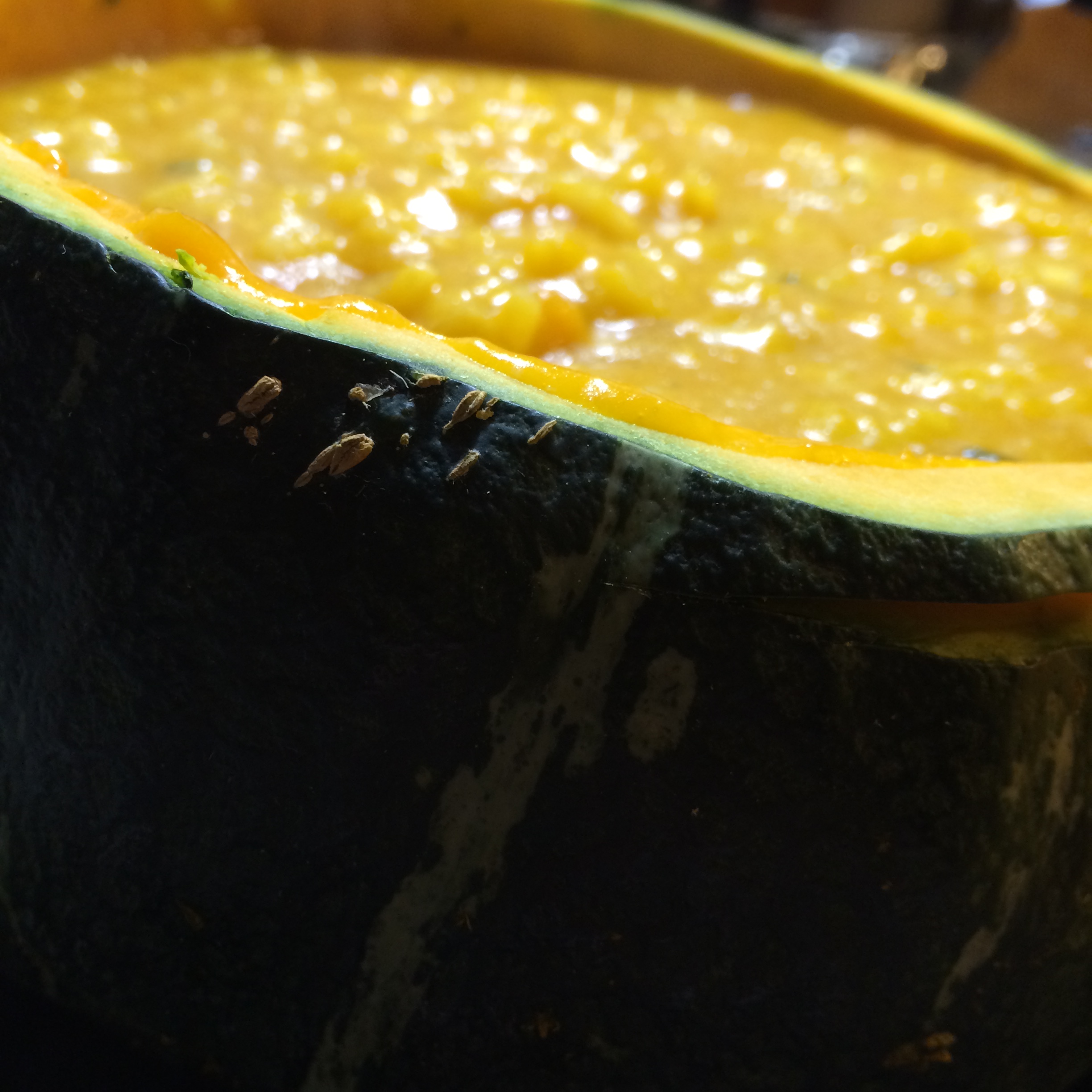 Then, pour the entire mixture into the hollowed-out squash, and serve!