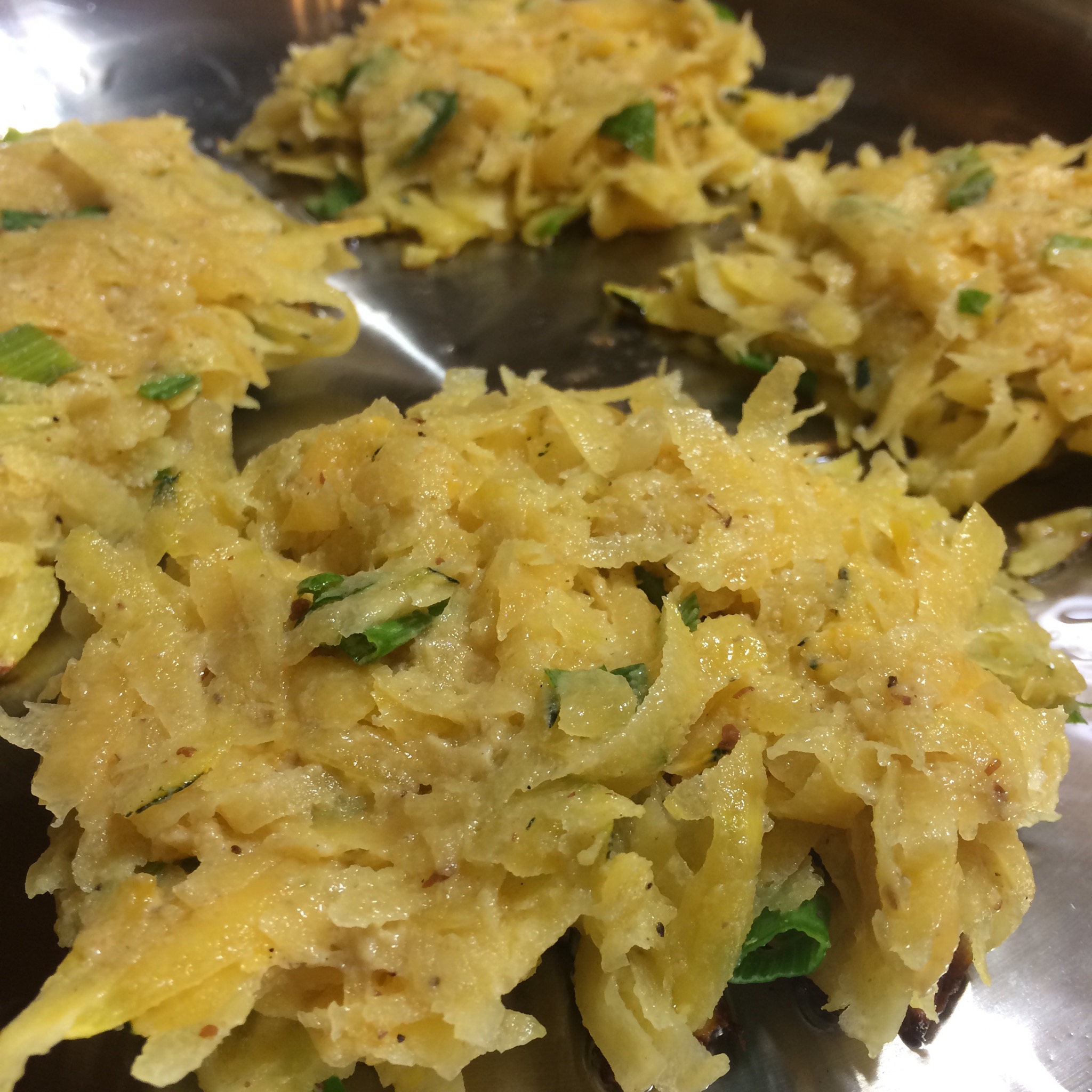 Form the squash mixture into small, flat patties and place them in the pan. They should sizzle in the oil once it’s properly heated.