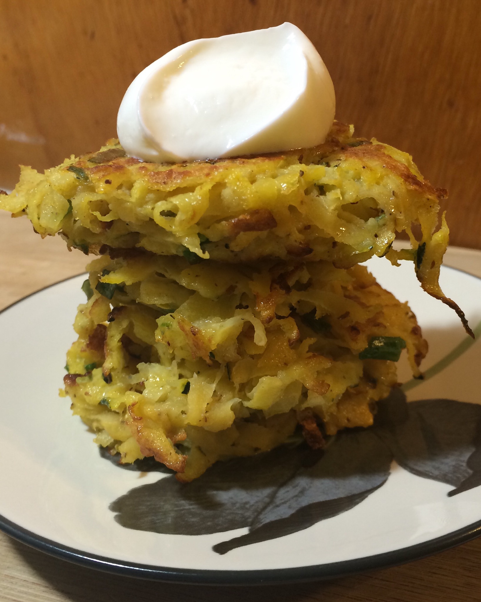 A few years ago, groggy from a raucous New Years Eve celebration the night before, Mike and I embarked on a fairly involved breakfast of zucchini fritters and pancakes, a cooking endeavor I can only attribute to having been younger and therefore more motivated than we should have been.