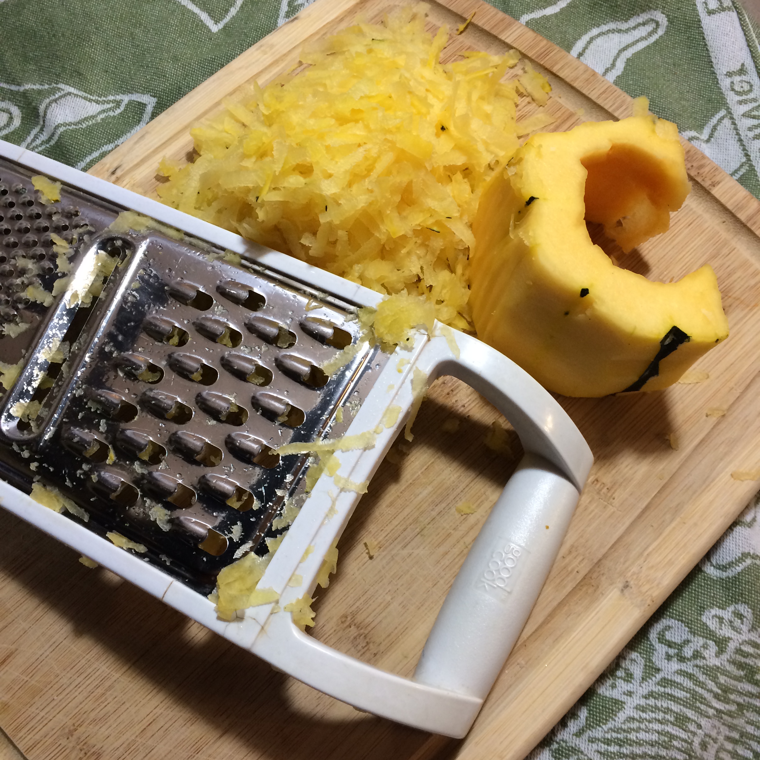 Using a hand or box grater, grate the squash until it’s mostly used up (you won’t be able to grate the entire thing, but get as much as you can).
