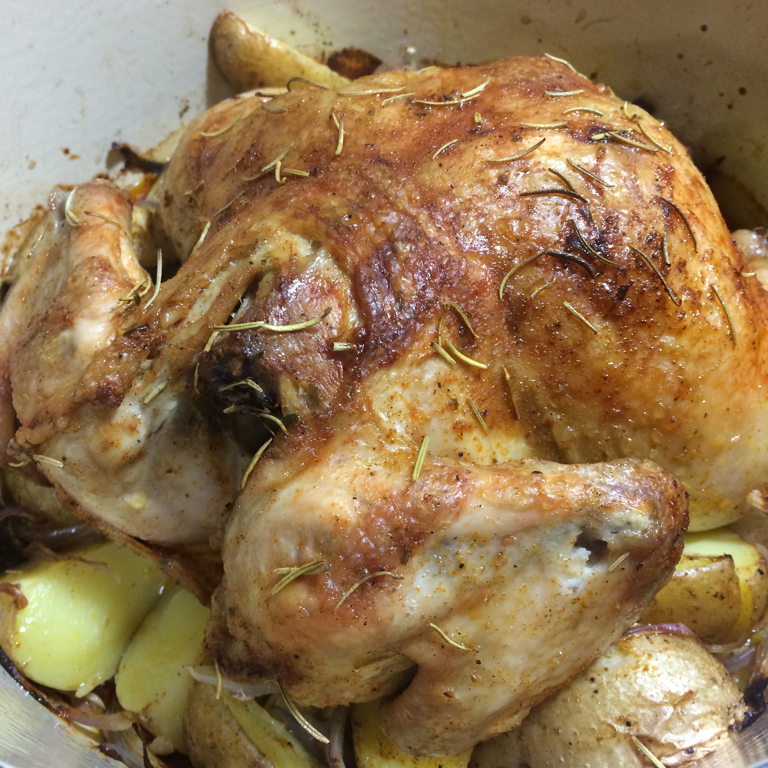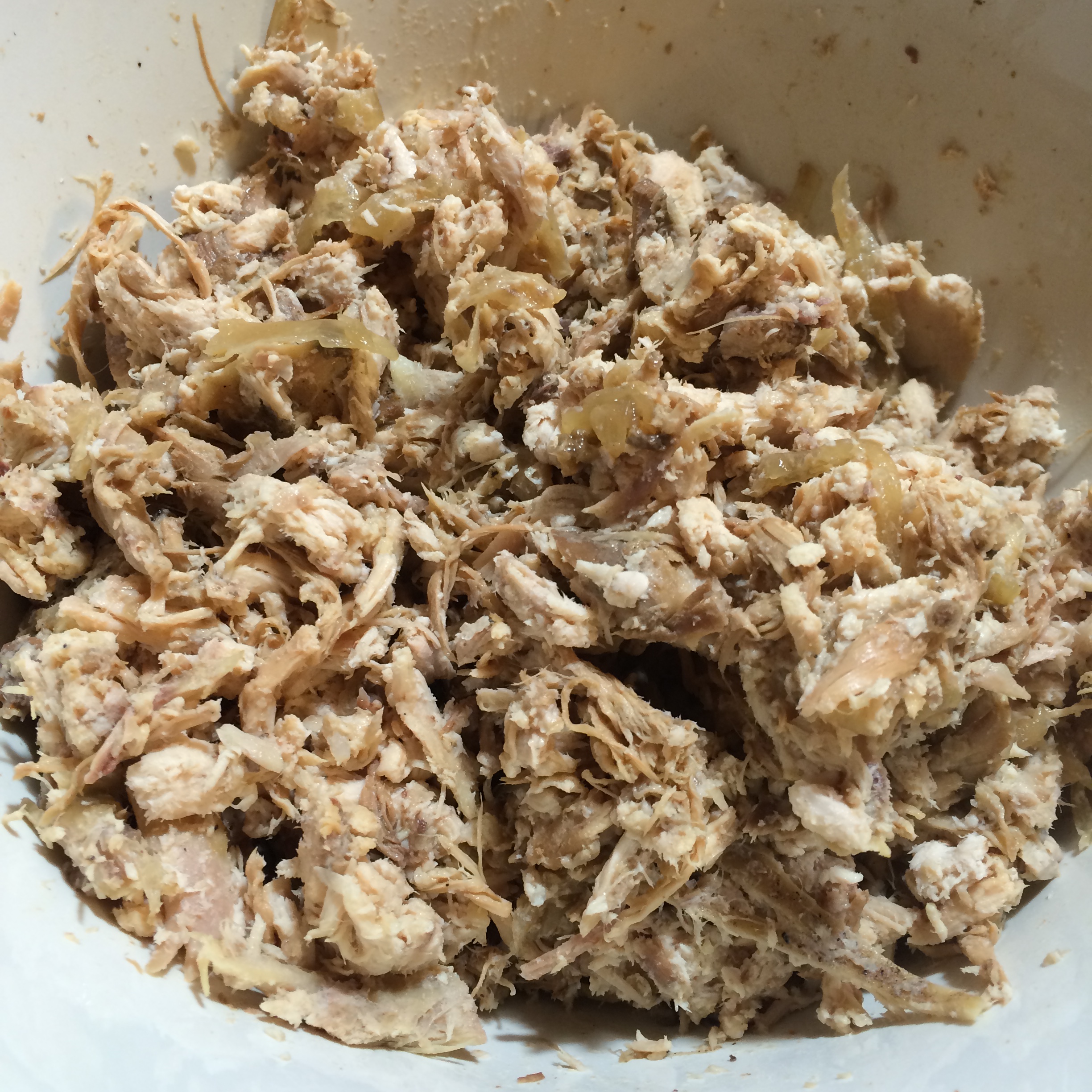 • Either 4 cooked chicken thighs or 1 whole crock pot chicken, (without the BBQ sauce) pulled with bones removed