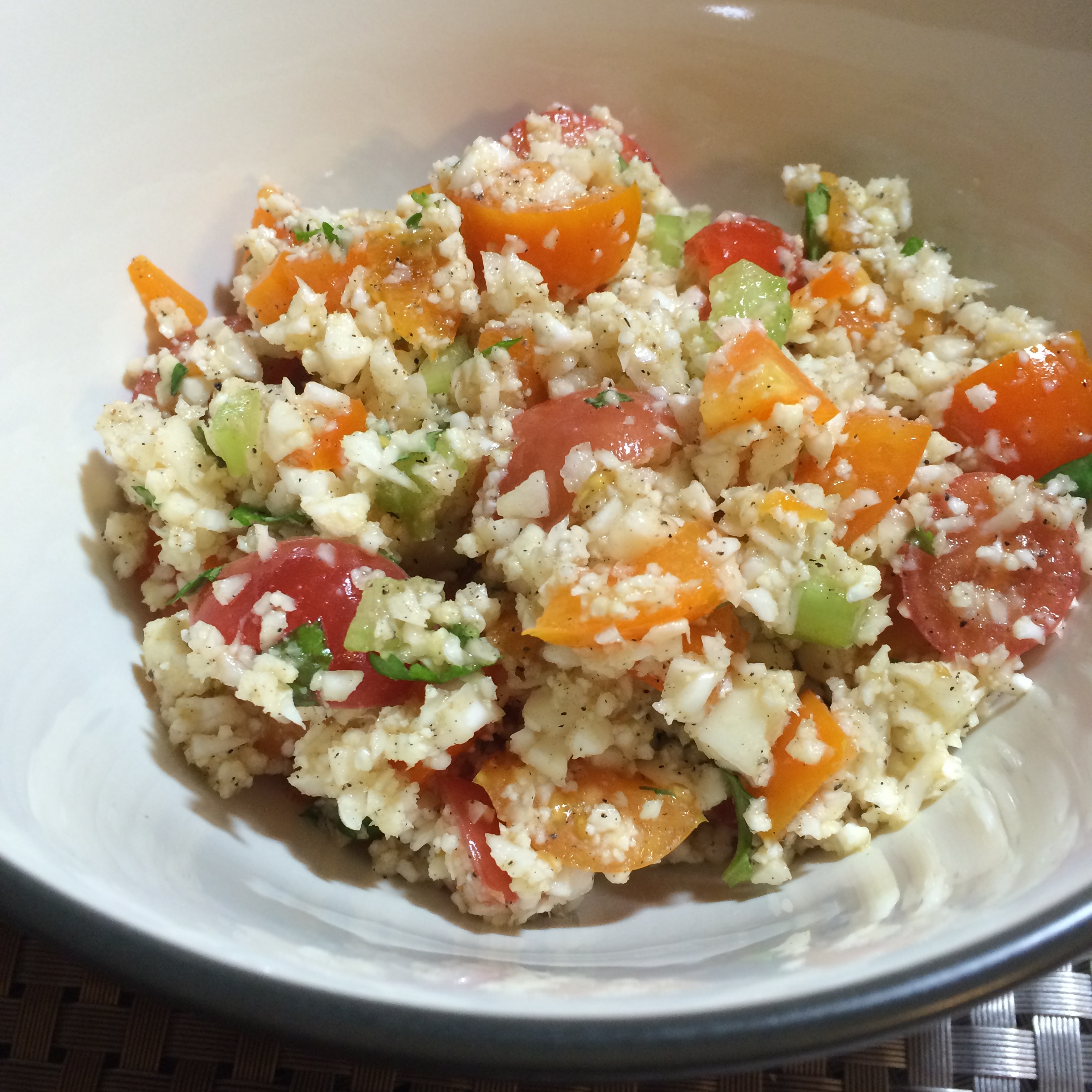 In a large bowl, mix the cauliflower with the remaining ingredients. Stir well and serve!