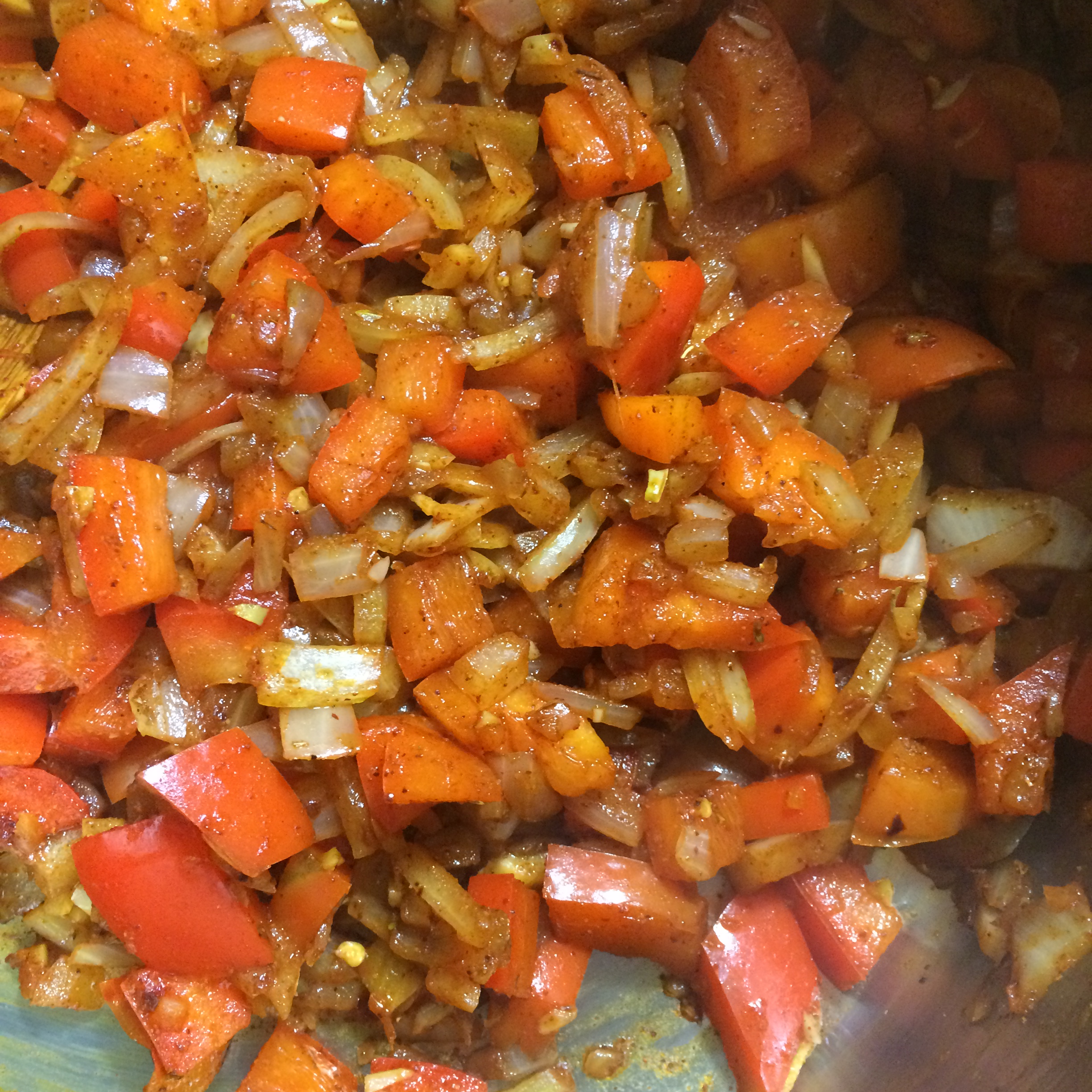 While the cornbread is baking, heat oil in a large skillet. Add the onion, bell pepper and garlic and saute until soft.