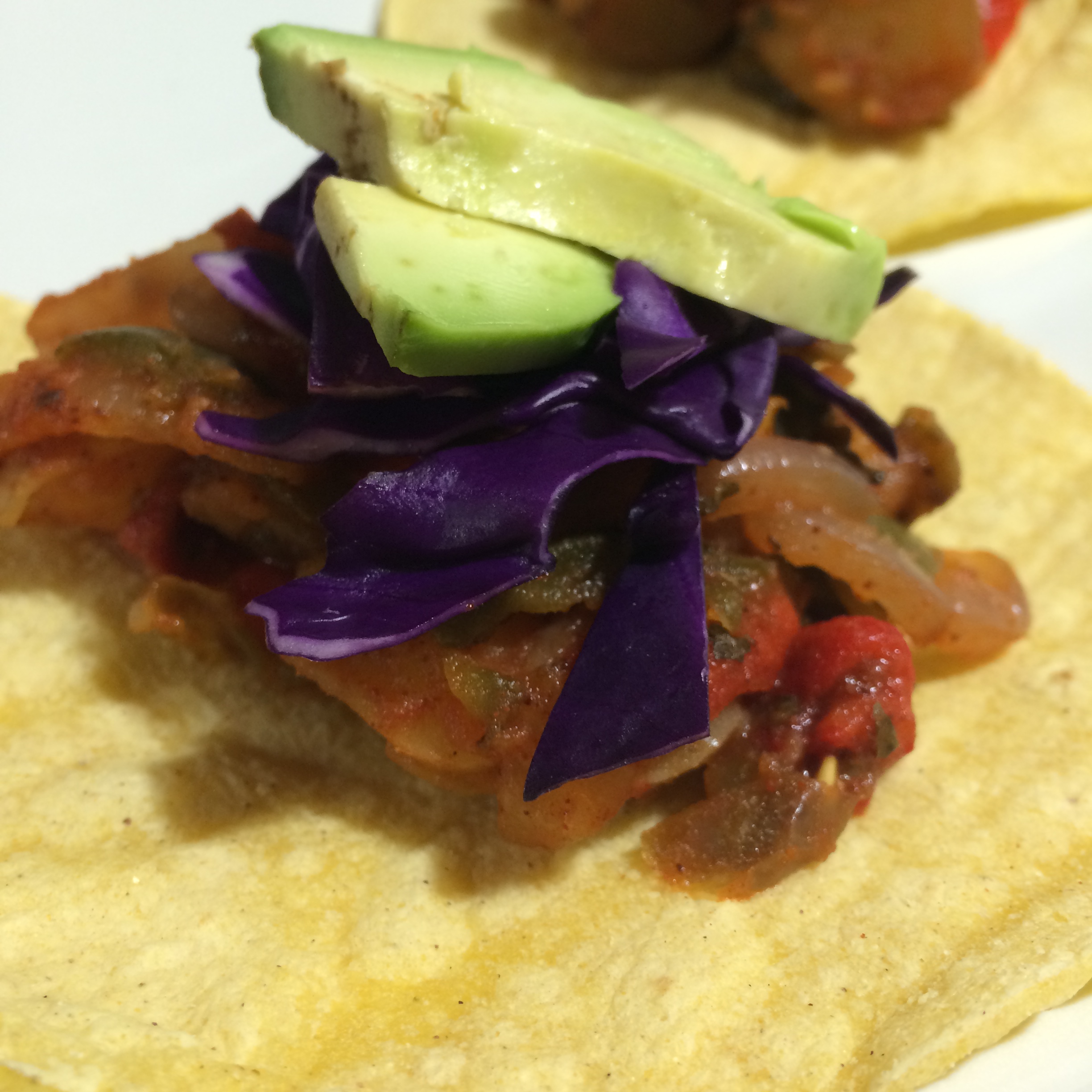 Lay out each tortilla and top generously with the potato filling. Garnish with a drop of salsa, some shredded cabbage and the avocado, and they’re ready to eat!
