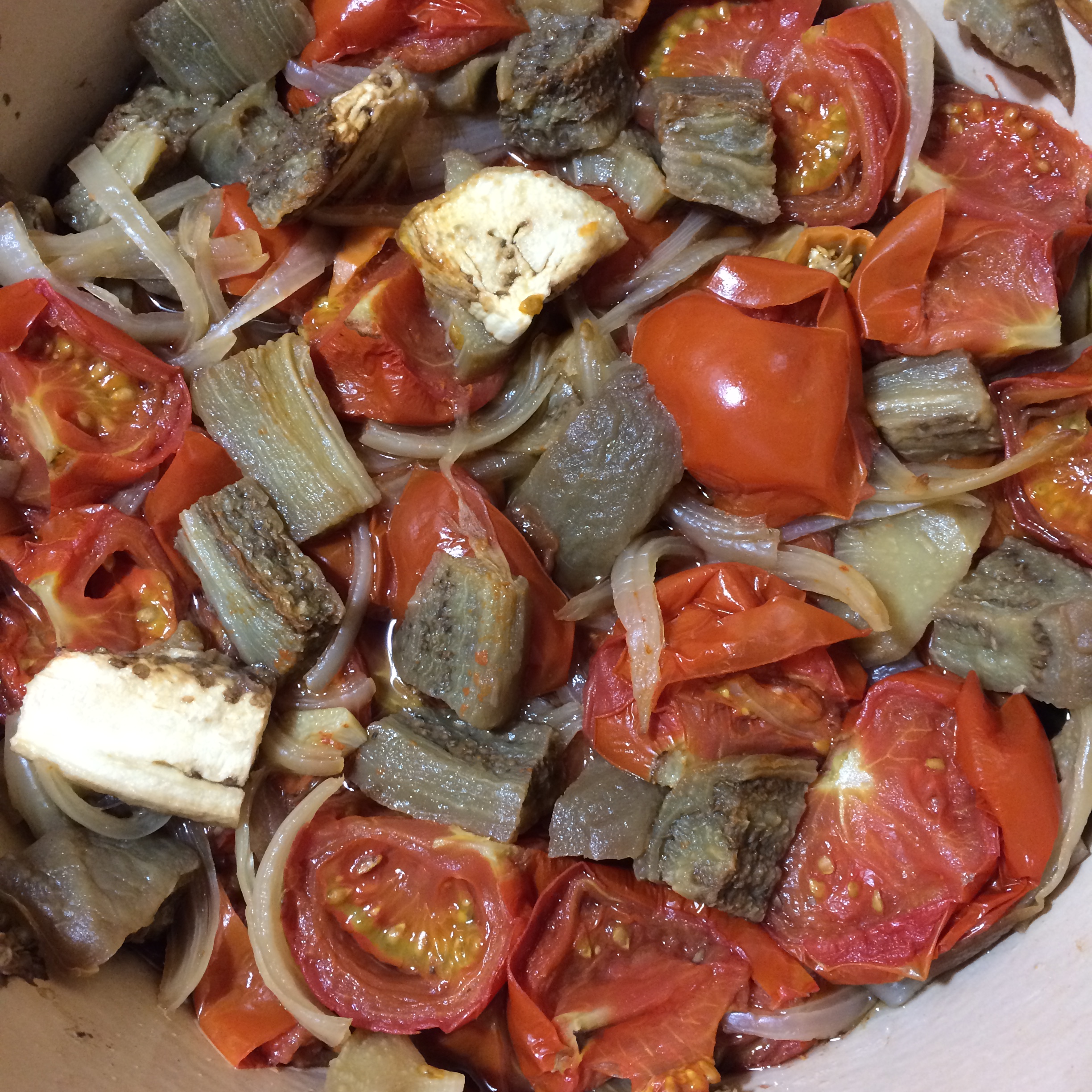 Combine the tomatoes, eggplant, onion and garlic in a large dutch oven or baking dish and bake, covered, for about 45-60 minutes. It’s done when the veggies are soft and cooked through with their juices at the bottom of the dish.