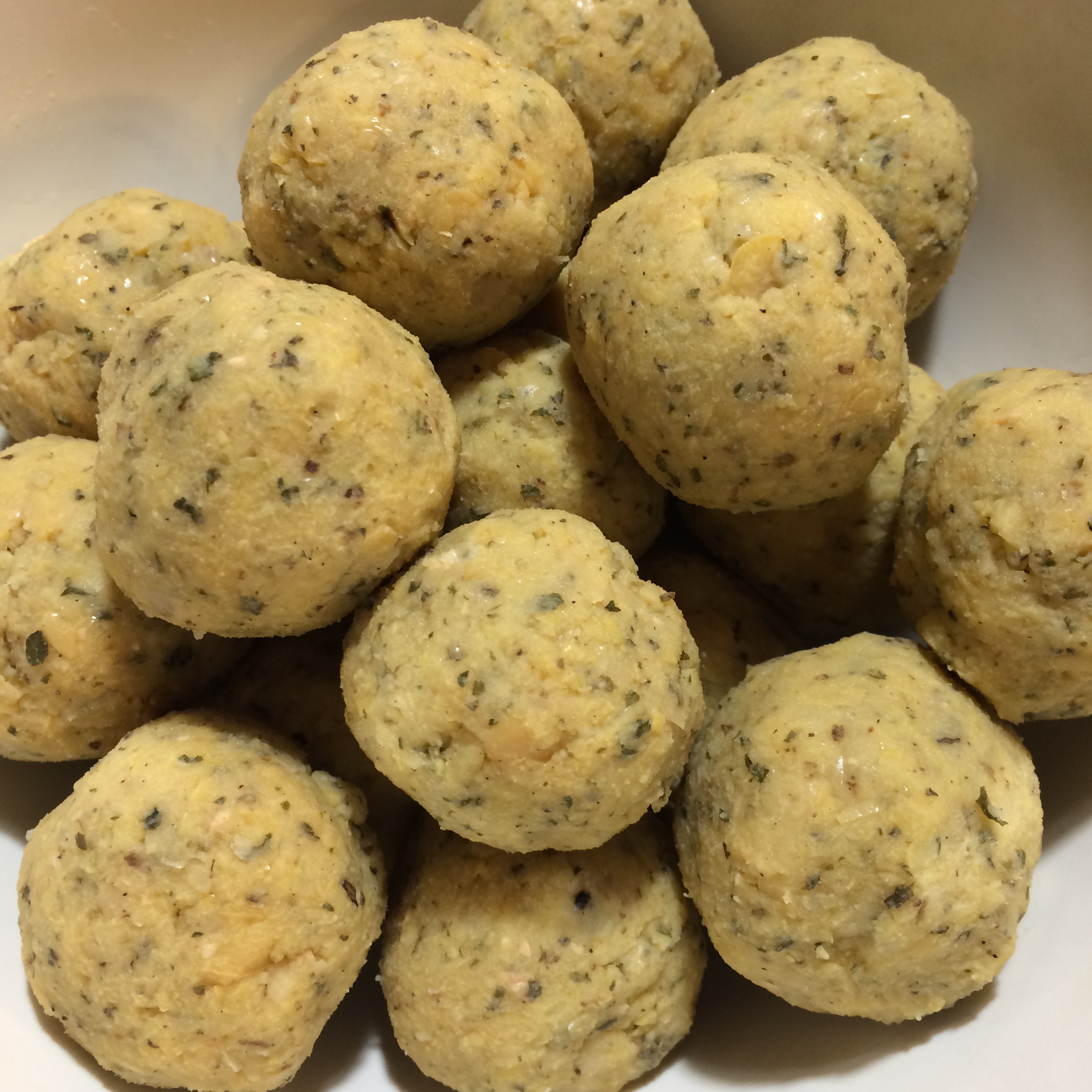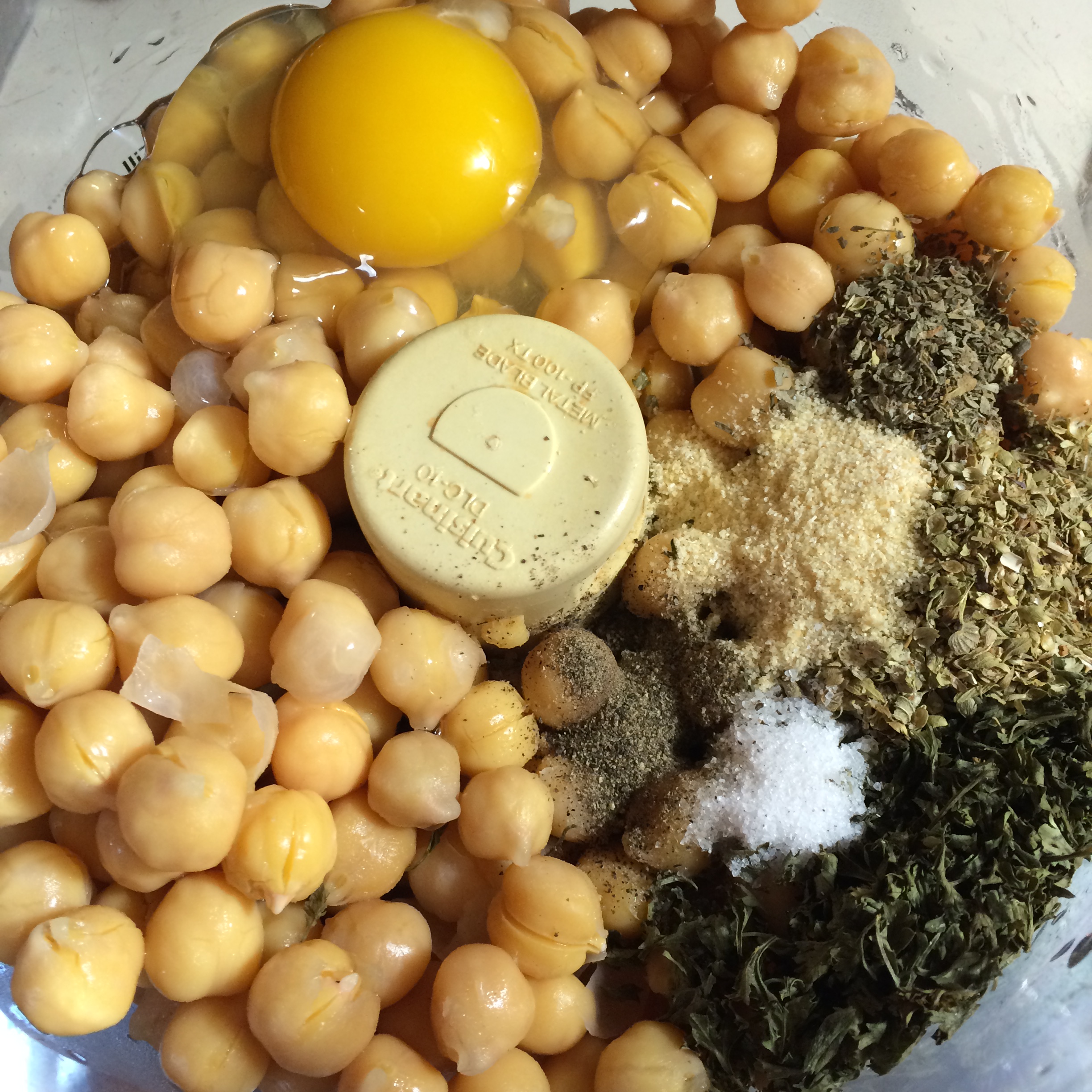 In a food processor, combine the chickpeas, egg, all the spices and the cornmealand blend until well-combined. This is your “meat”ball dough.