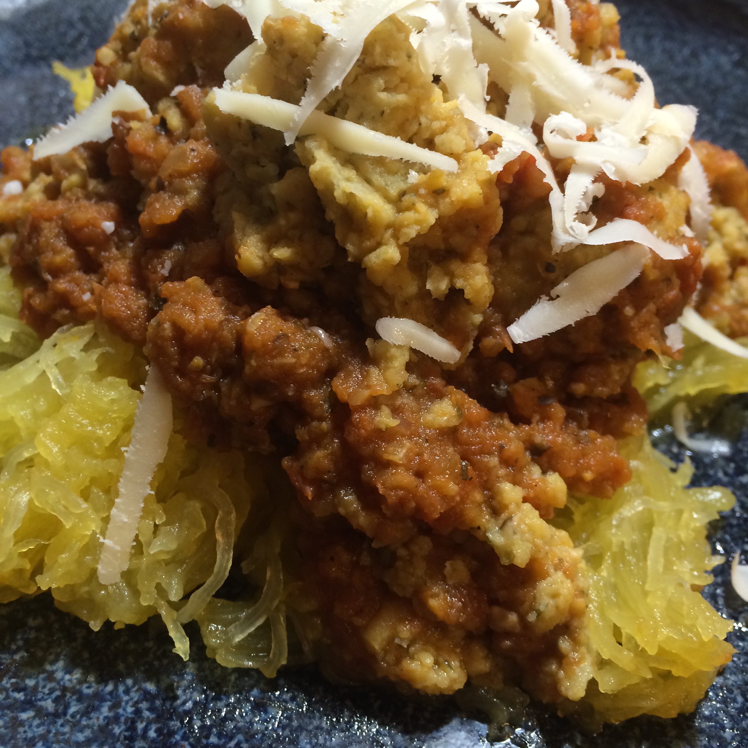 Serve over baked spaghetti squash and top with a sprinkle of Parmesan cheese.
