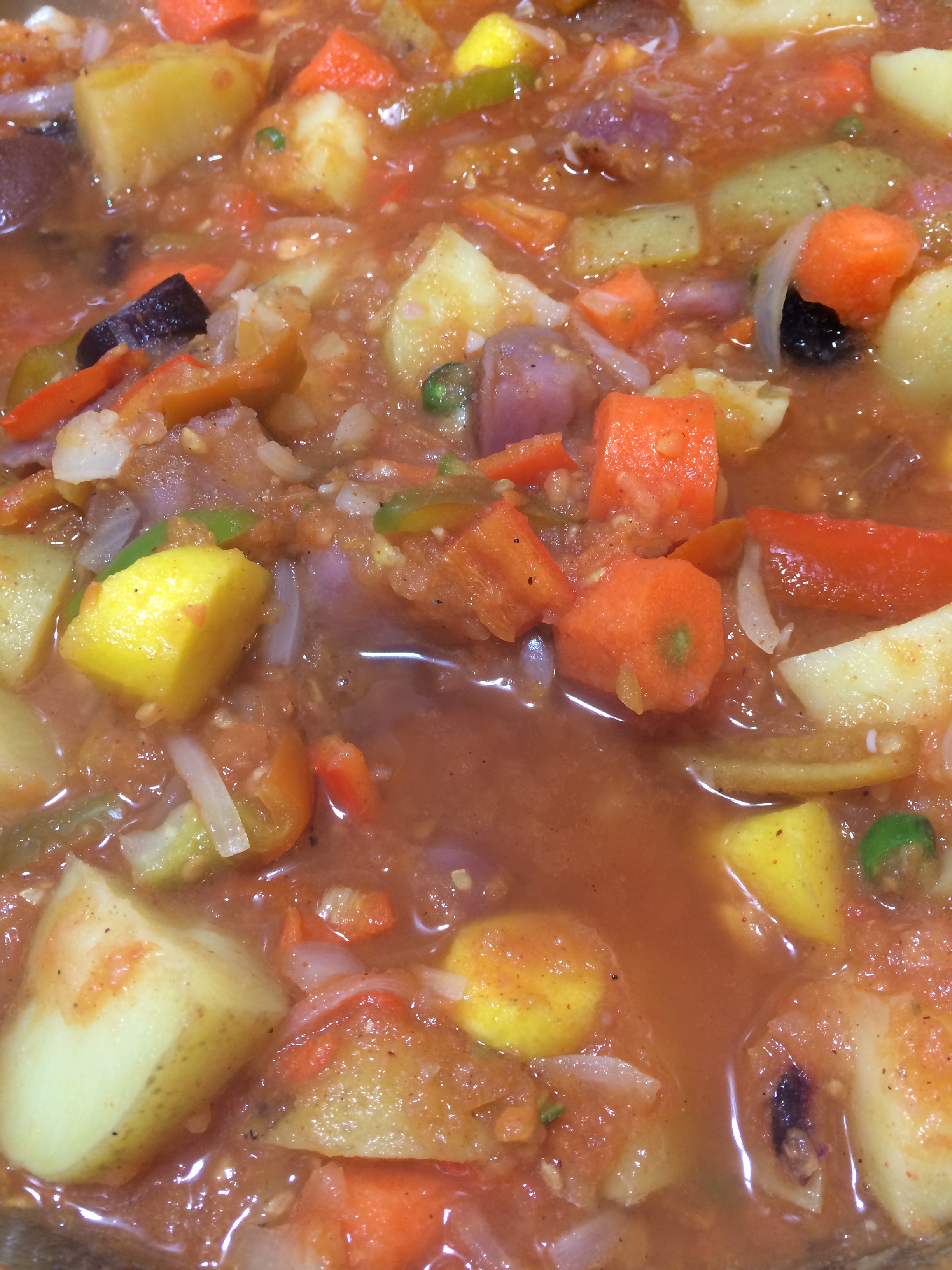 Strain the potatoes and carrots when ready and add those to the tomato sauce.