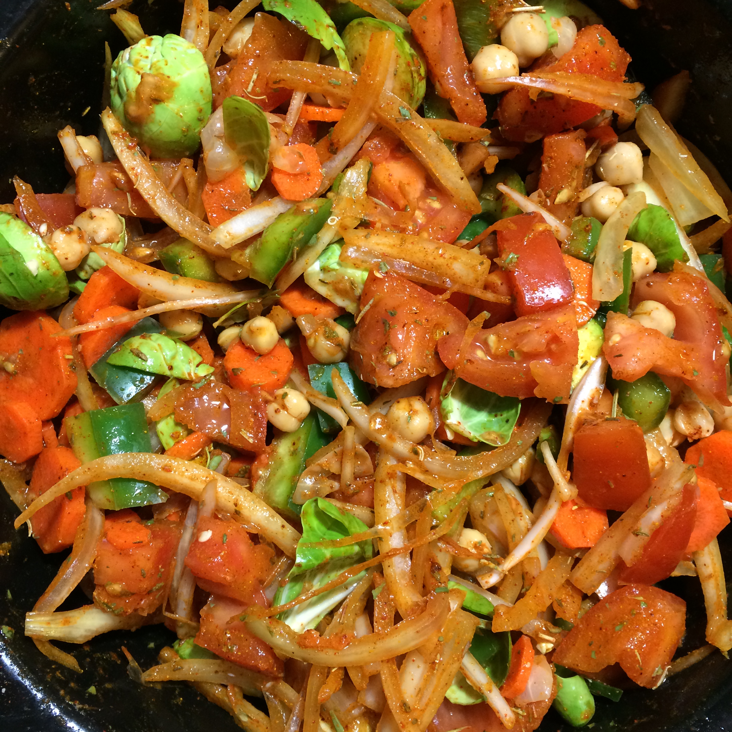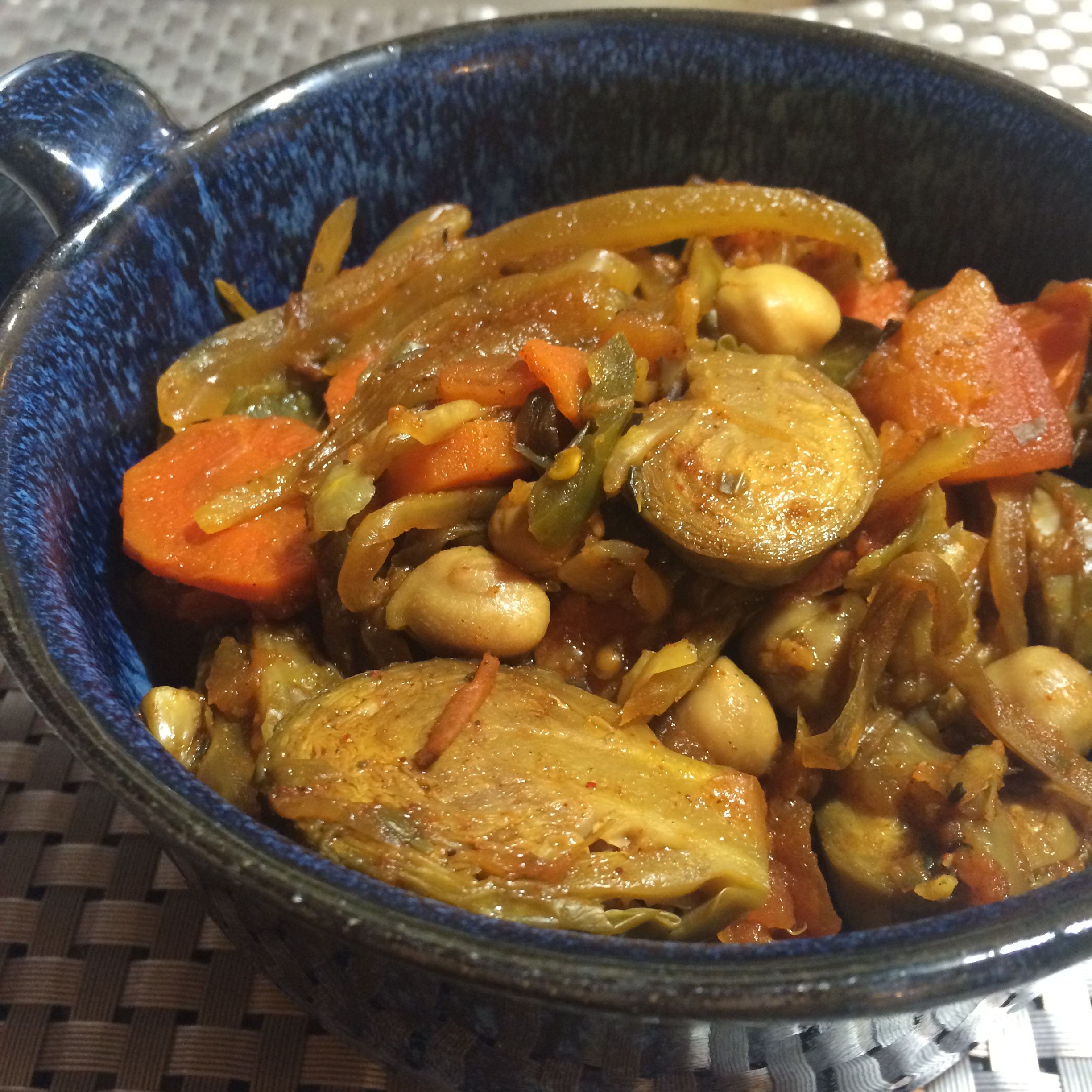 Combine the tomatoes, eggplant, onion and garlic in a large dutch oven or baking dish and bake, covered, for about 45-60 minutes. It’s done when the veggies are soft and cooked through with their juices at the bottom of the dish.
