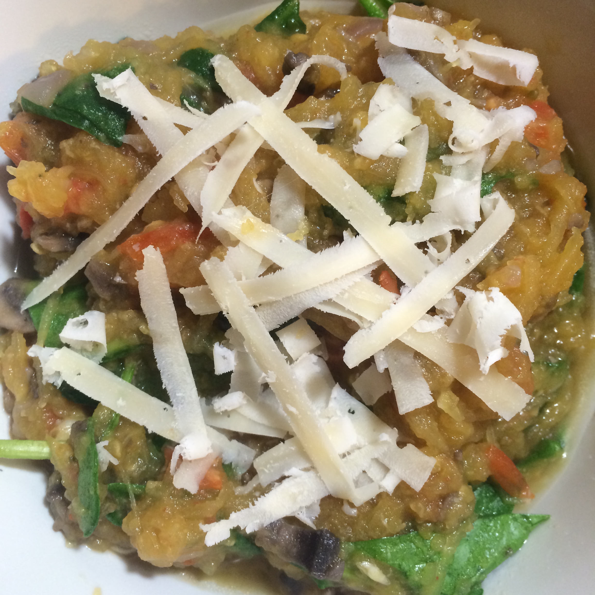 Serve over baked spaghetti squash and top with a sprinkle of Parmesan cheese.